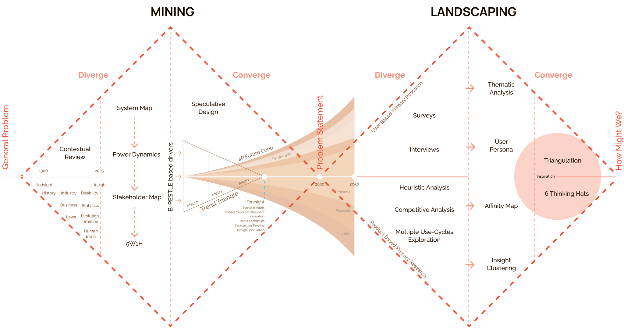 A hybrid approach combining the Disruptive Design Framework and Human-Centered Design Framework, built upon the foundation of the Double Diamond model.