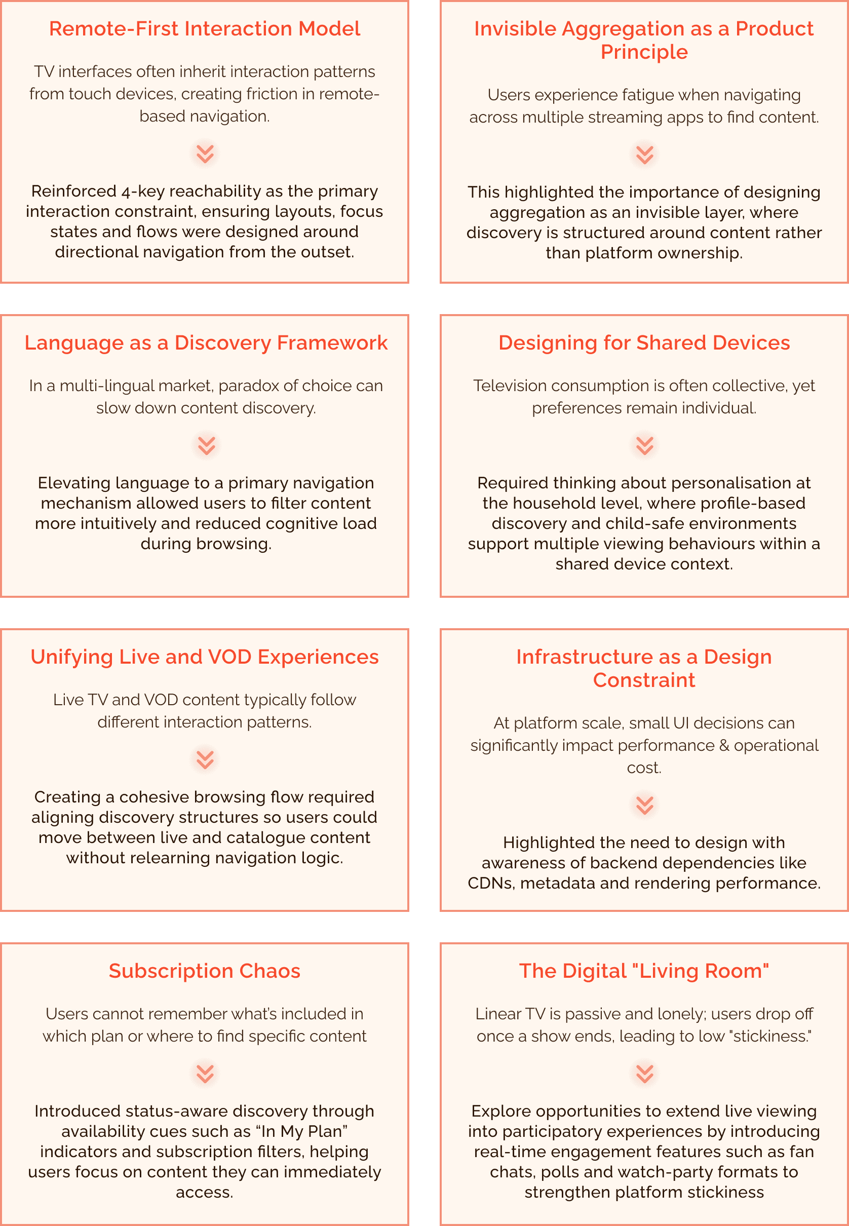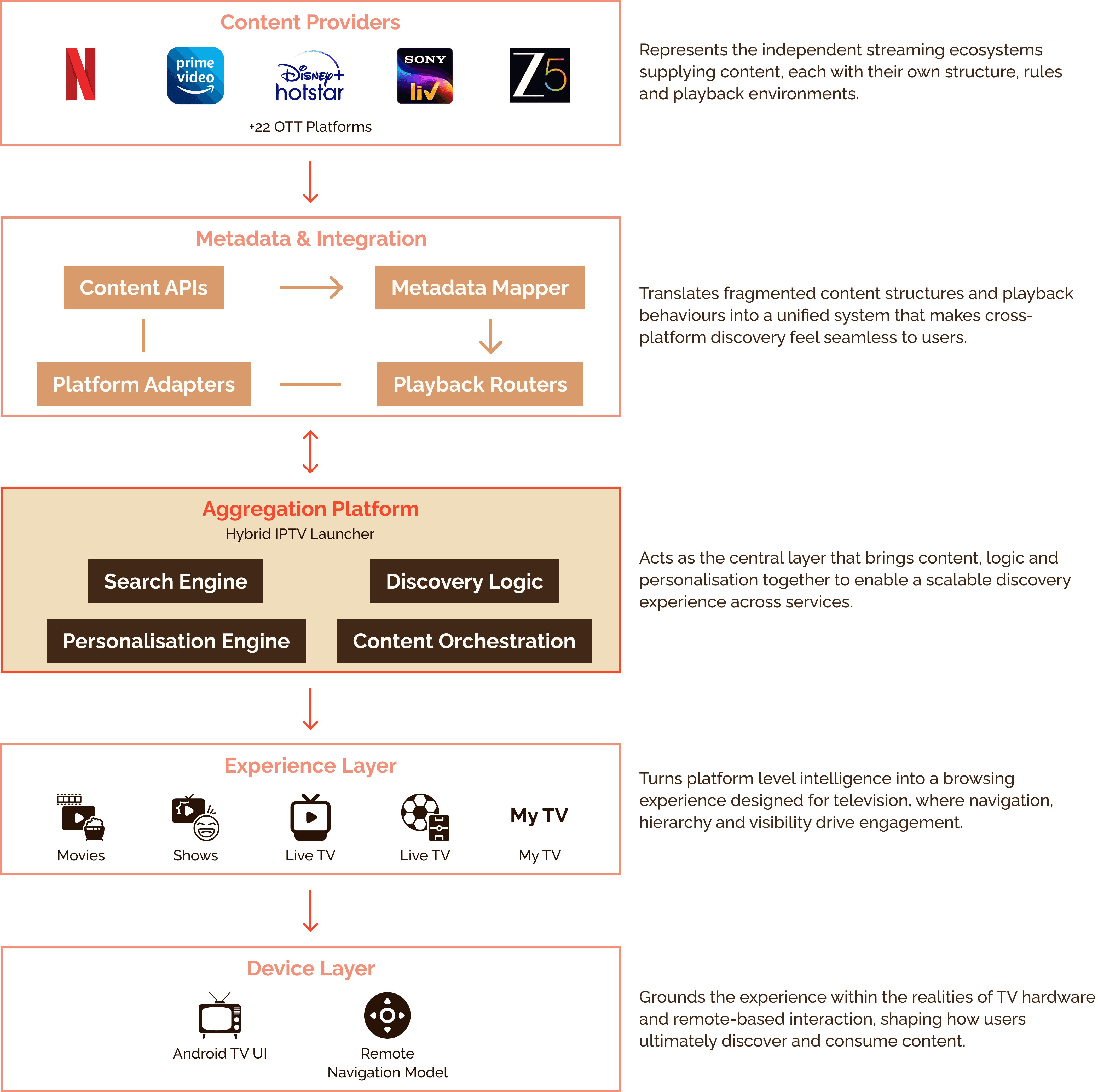 Unlike standalone streaming apps, an aggregated launcher must integrate multiple content infrastructures, each with its own browsing patterns, metadata structures and interface conventions.