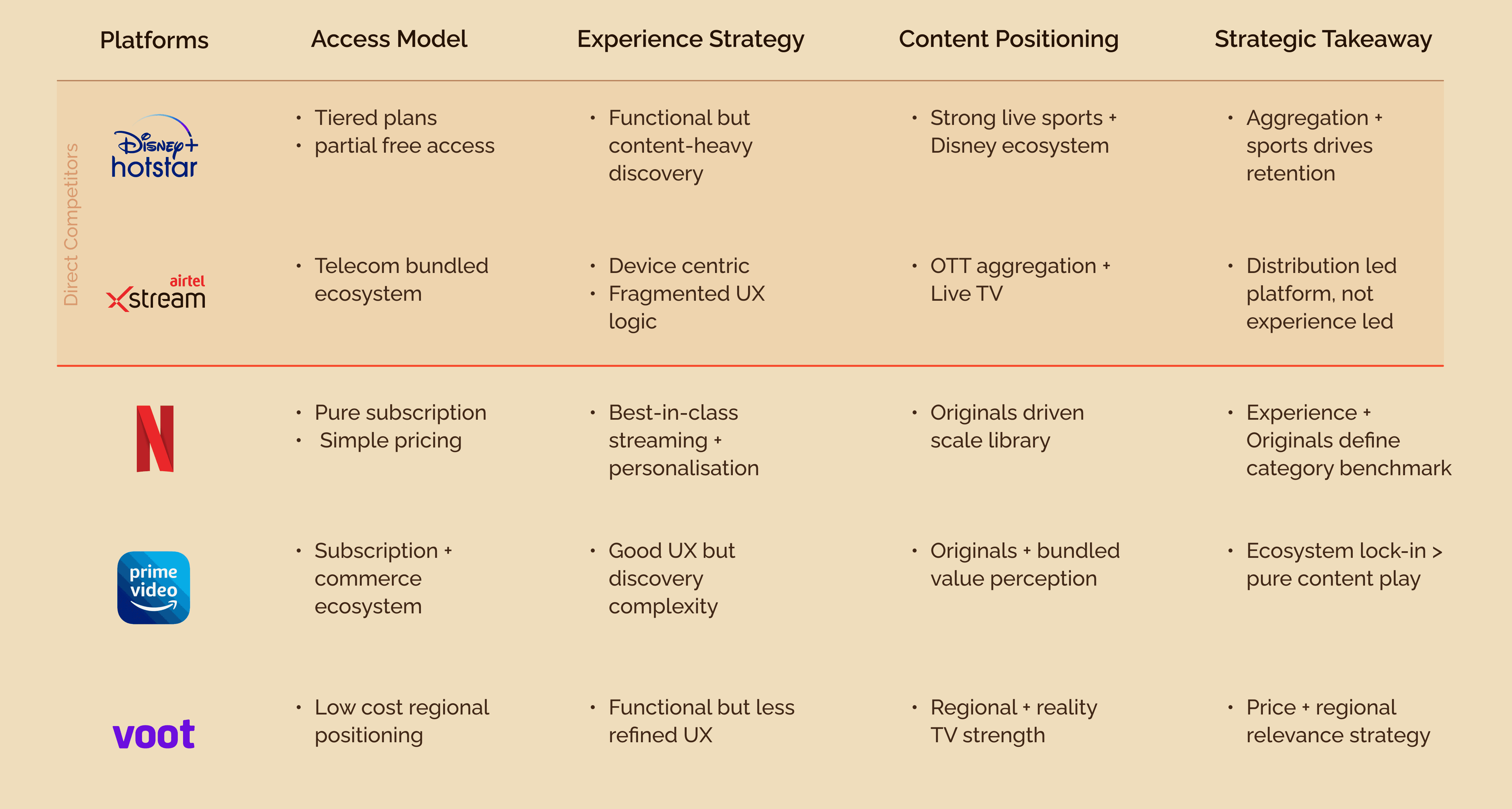 The competitive landscape was mapped across platforms that define today’s fragmented streaming experience, allowing the design to respond to real-world constraints around aggregation, access, and content discovery.