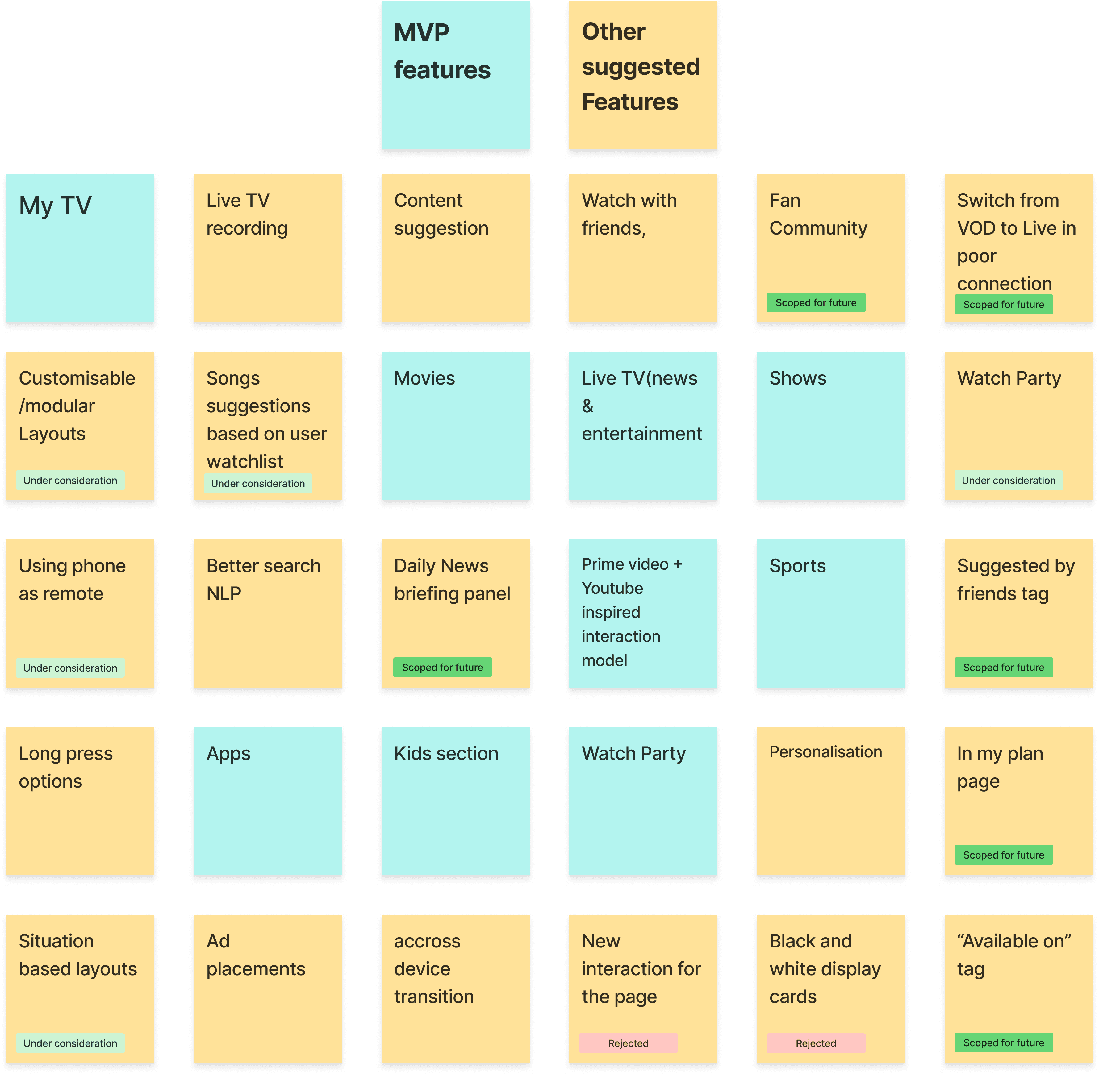 We condensed all the floating ideas to a list of features. They were segregated into MVP features, some scoped for future release, some under consideration and 2 rejected